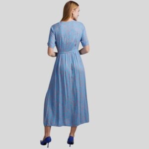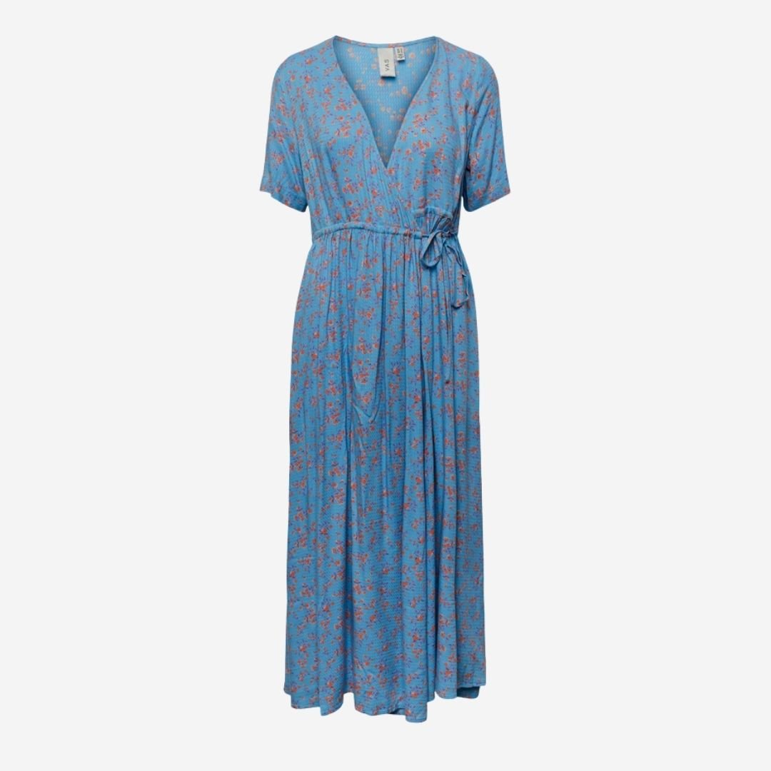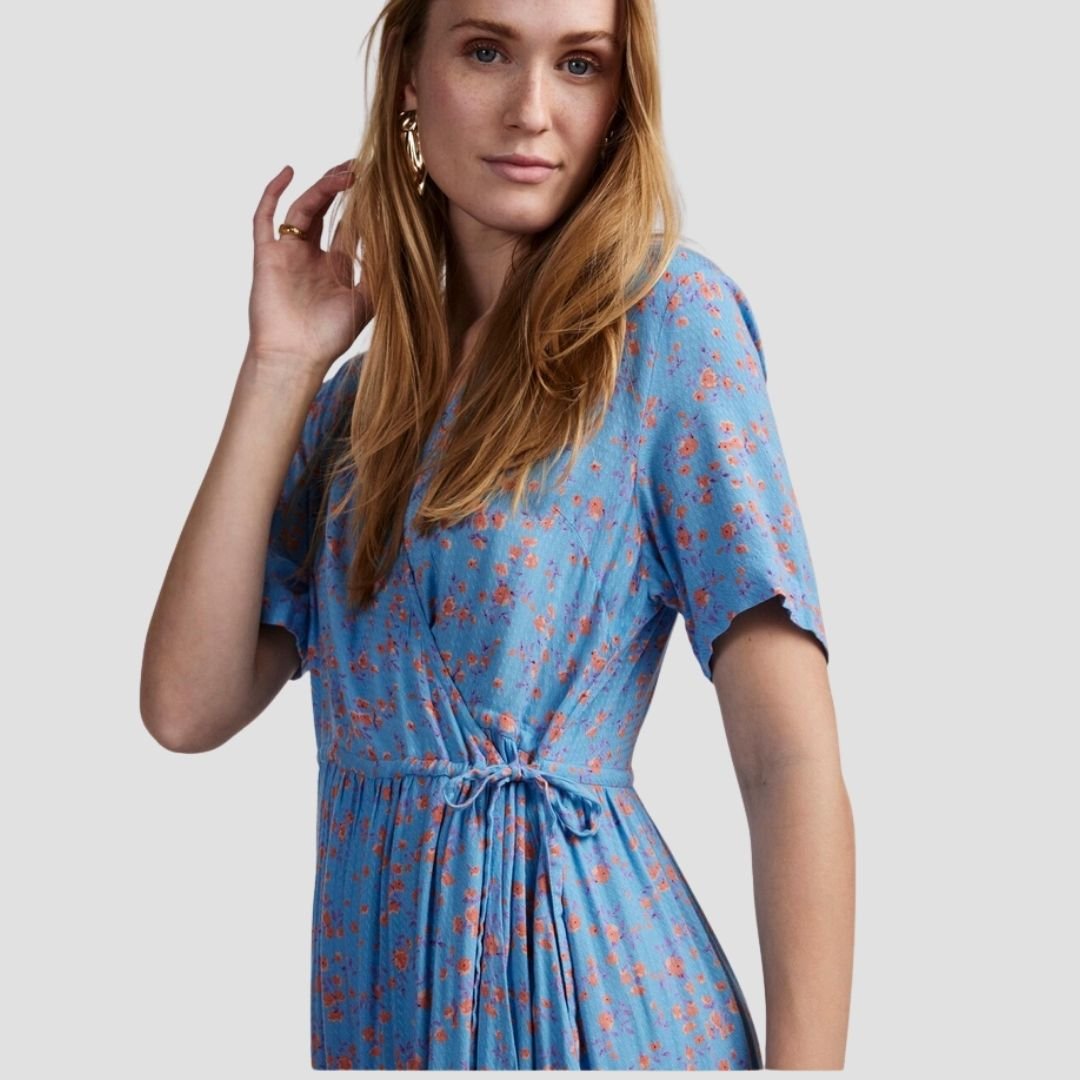 Γαλάζιο μακρύ φόρεμα με διακριτικό φλοράλ μοτίβο σε πορτοκαλί αποχρώσεις. Κρουαζέ, με κοντά μανίκια και ζώνη στη μέση. Αέρινη γραμμή και ανάλαφρο ύφασμα που προσφέρουν άνεση και κίνηση.