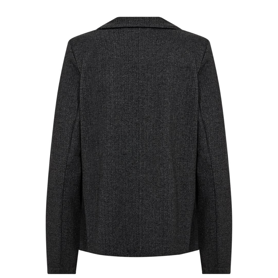 Το μπλέϊζερ της Soyaconcept είναι ένα διαχρονικό σακάκι σε ανθρακί χρώμα, σχεδιασμένο σε άνετη, θηλυκή γραμμή. Διαθέτει γιακά με πέτο, δύο κουμπιά και μαλακή υφή που θυμίζει πλεκτό ύφασμα. Κατασκευασμένο από ελαστικό μείγμα υλικών, για άψογη εφαρμογή και άνεση όλη μέρα. Ιδανικό για το γραφείο ή για smart-casual συνδυασμούς, φοριέται εξίσου όμορφα πάνω από πλεκτό ζιβάγκο ή μεταξωτό τοπ.