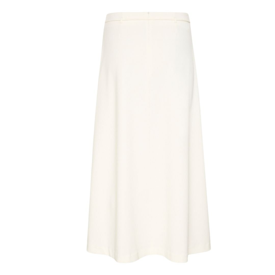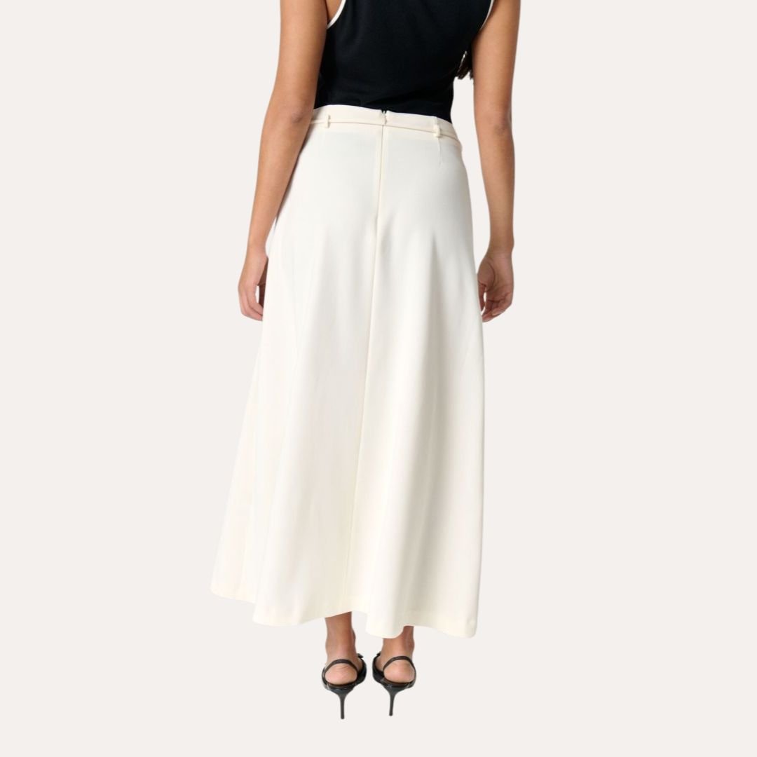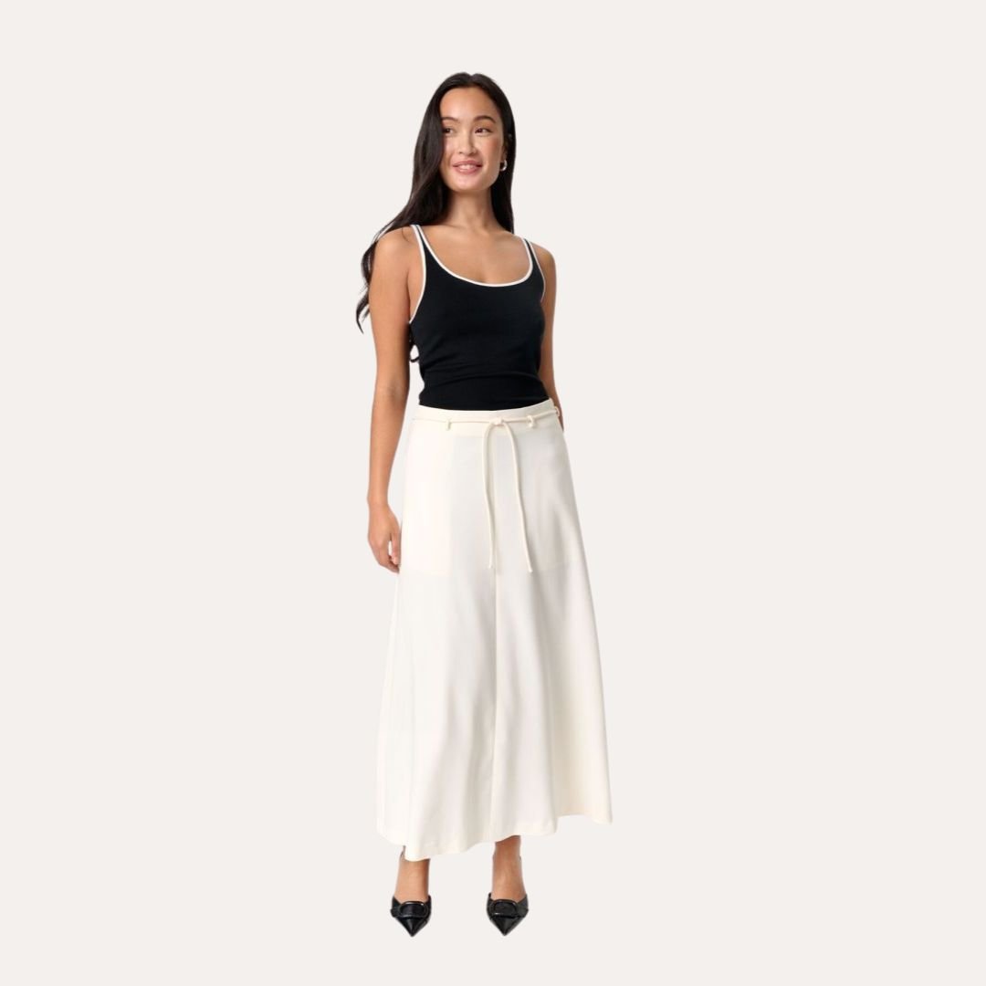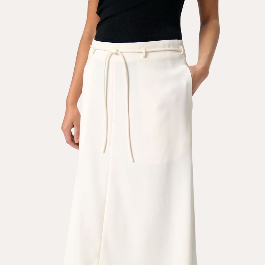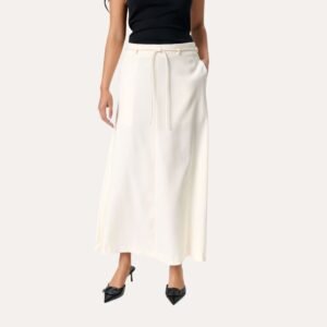 Μακριά φούστα σε χρώμα σπασμένο λευκό (off white), σχεδιασμένη σε ανάλαφρη γραμμή Α. Διαθέτει λεπτή ζώνη-κορδόνι στη μέση, θηλάκια για καλύτερη εφαρμογή και πλαϊνές τσέπες για πρακτικότητα.