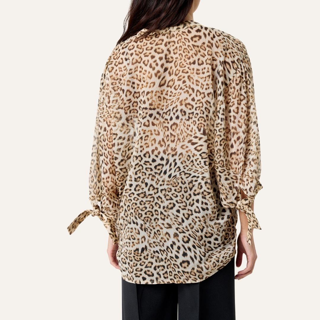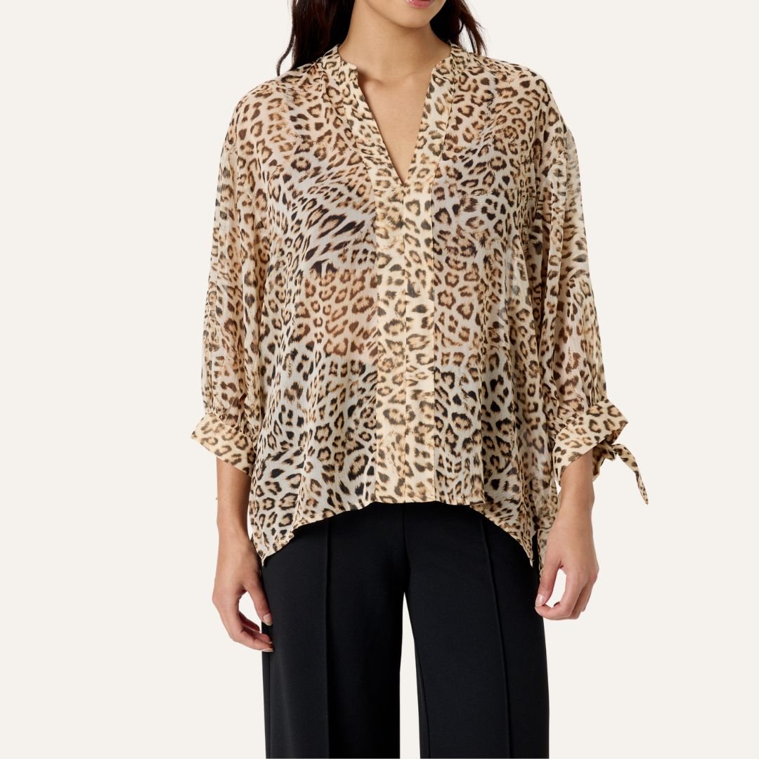 Αέρινη μπλούζα με λεοπάρ μοτίβο από τη Soaked in Luxury, σε ανάλαφρη, ημιδιάφανη υφή που χαρίζει κομψή κίνηση. Διαθέτει χαλαρή γραμμή, V ντεκολτέ χωρίς κουμπιά και μανίκια 3/4 με λεπτομέρεια δεσίματος στις άκρες. Φοριέται άνετα από το πρωί στο γραφείο μέχρι βραδινή έξοδο, συνδυάζεται υπέροχα με μαύρο παντελόνι, denim ή φούστα.