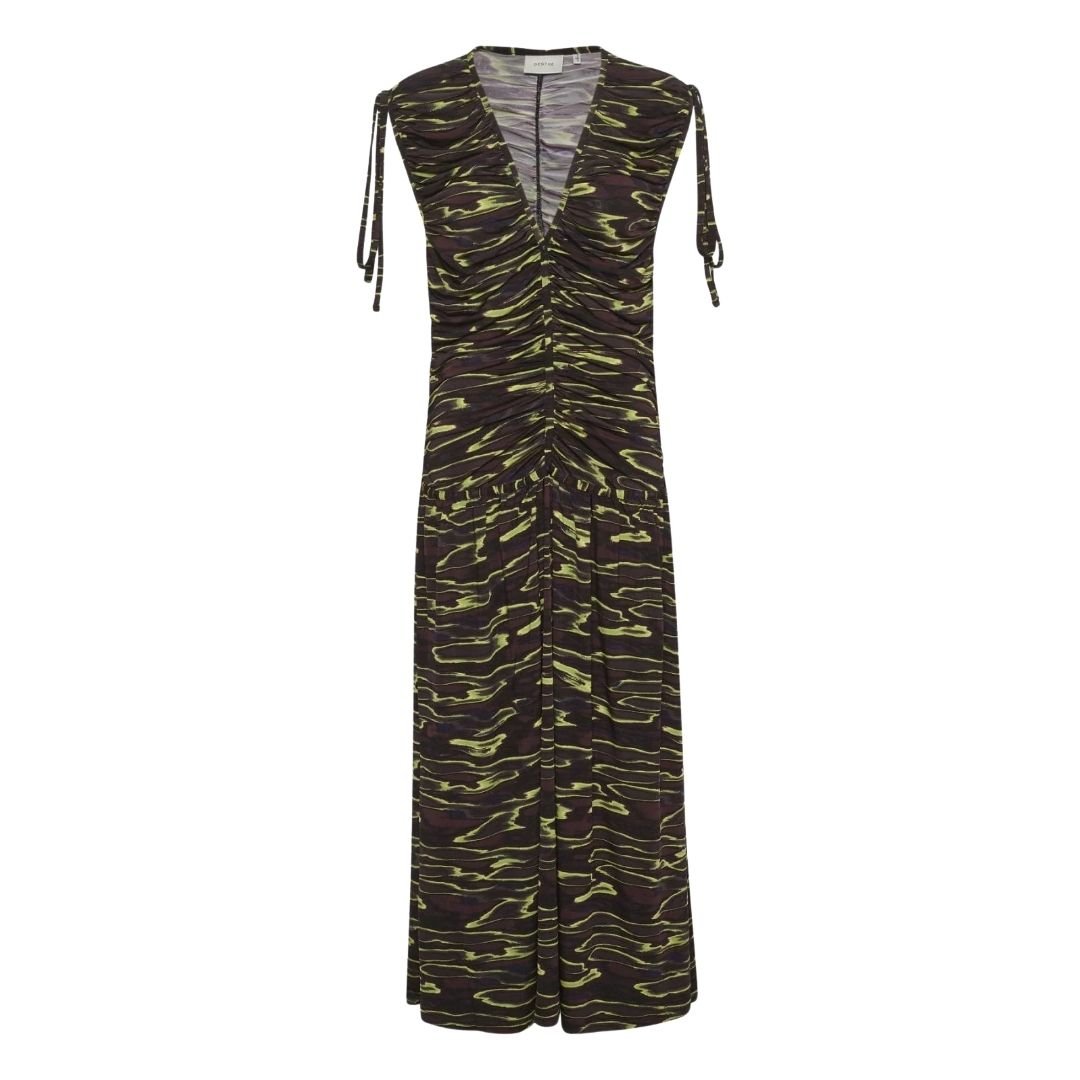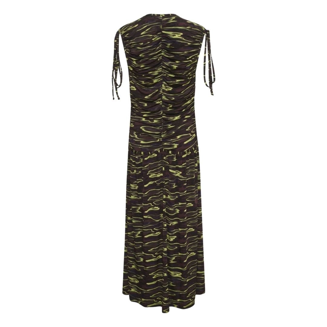 Μακρύ φόρεμα από την Gestuz με μοτίβο που θυμίζει νερό, σε κίτρινες αποχρώσεις. Το φόρεμα έχει V-ντεκολτέ, είναι αμάνικο και διαθέτει σούρες σε όλο το σχέδιο.
