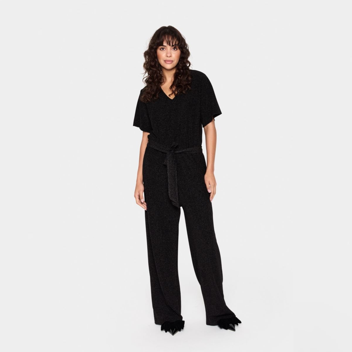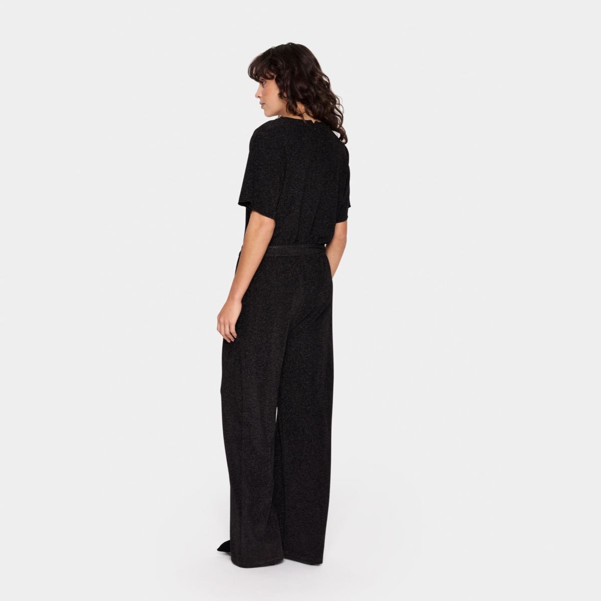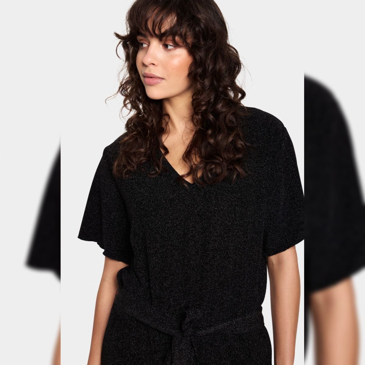 Μαύρο χρώμα με διακριτική λάμψη, V λαιμόκοψη και κοντά μανίκια, ζώνη από το ίδιο ύφασμα.Ίσια, άνετη γραμμή παντελονιού.