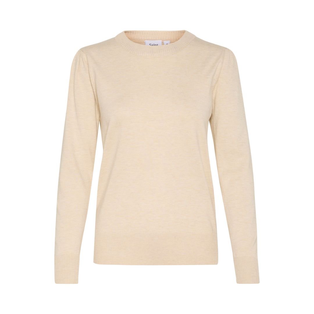 • Μπεζ πλεκτή μπλούζα με μακρύ μανίκι και στρογγυλή λαιμόκοψη, μπροστινή όψη.