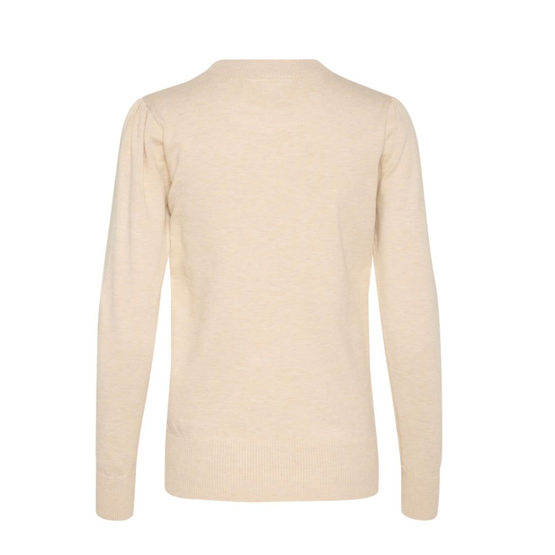 Μπεζ λεπτή πλεκτή μπλούζα με μακρύ μανίκι, στρογγυλή λαιμόκοψη και μικρή σούρα στο μανίκι.