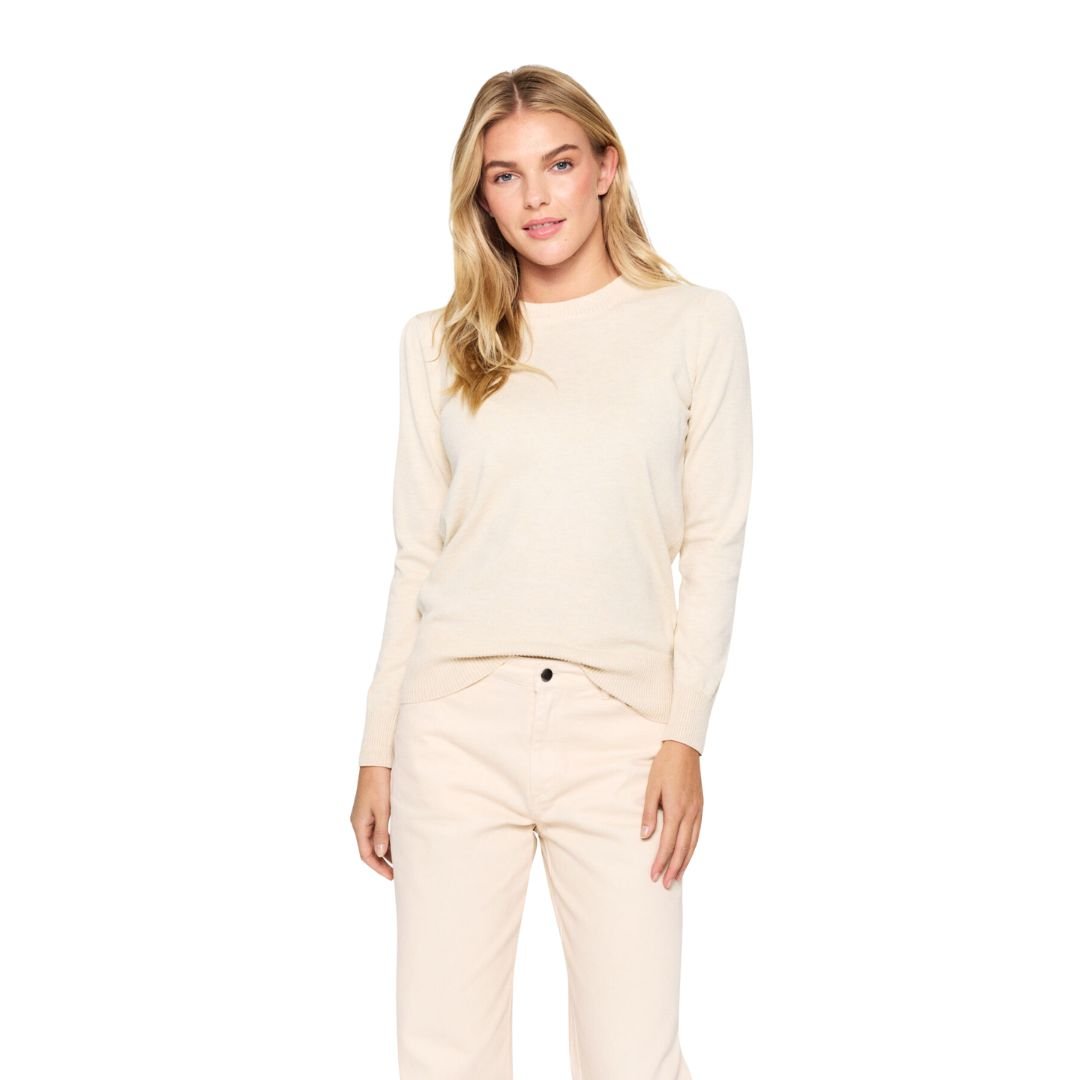 • Γυναίκα με ξανθά μαλλιά φοράει μπεζ πλεκτή μπλούζα με μακρύ μανίκι και στρογγυλή λαιμόκοψη, σετ με ανοιχτόχρωμο παντελόνι, μπροστινή όψη.