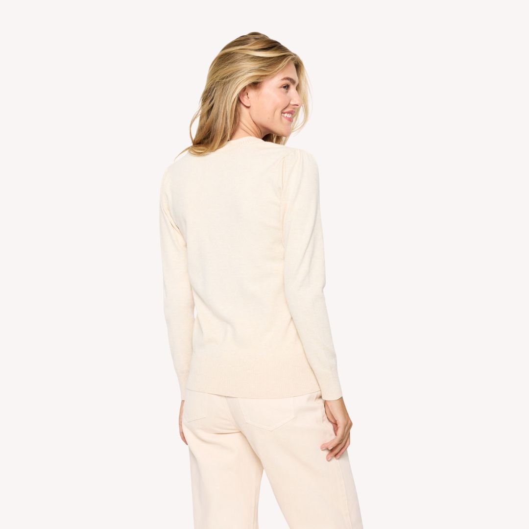 • Γυναίκα με ξανθά μαλλιά φοράει μπεζ πλεκτή μπλούζα με μακρύ μανίκι και στρογγυλή λαιμόκοψη, σετ με ανοιχτόχρωμο παντελόνι, πίσω όψη.
