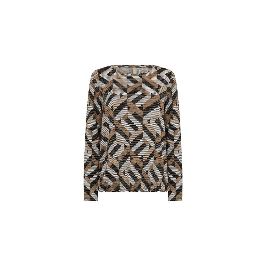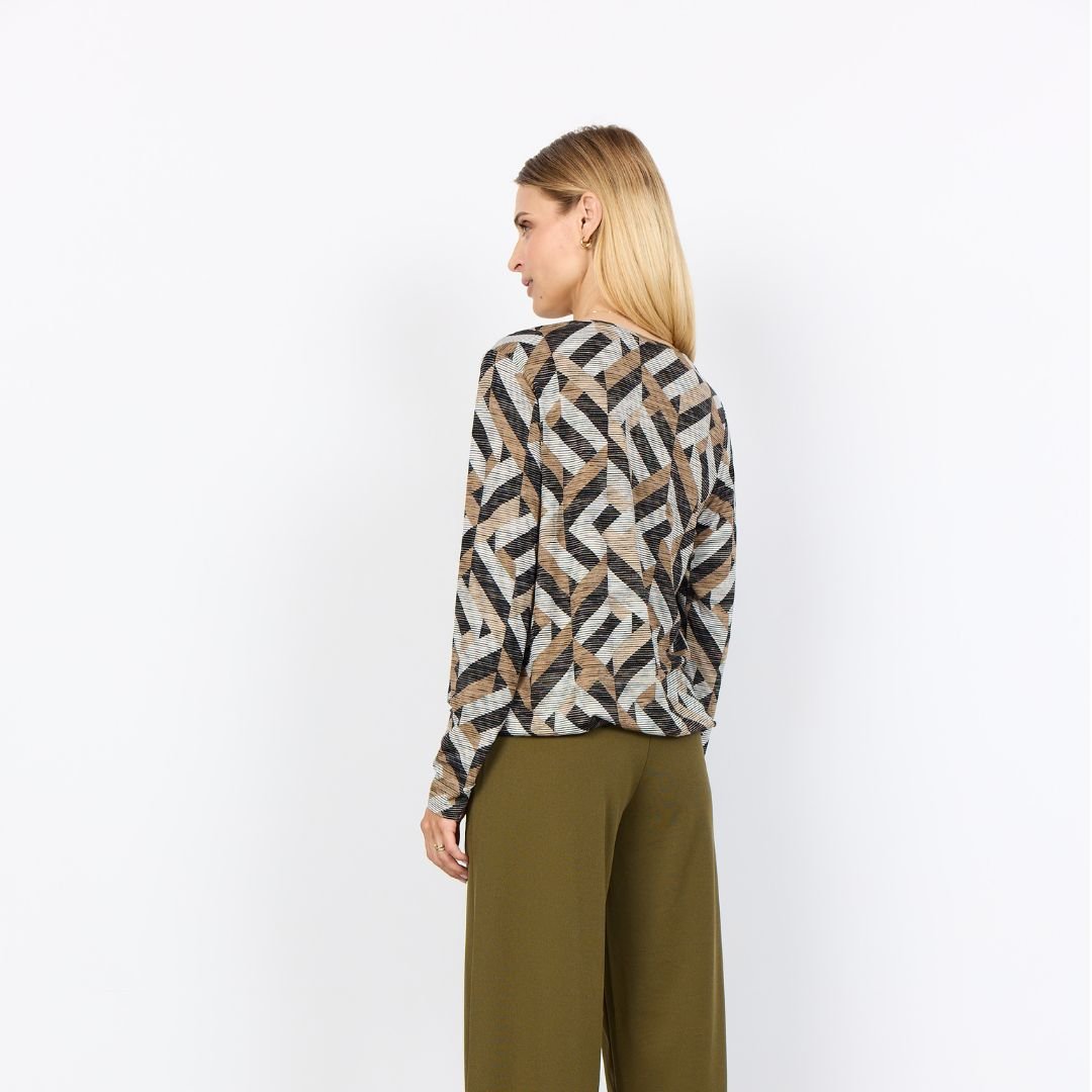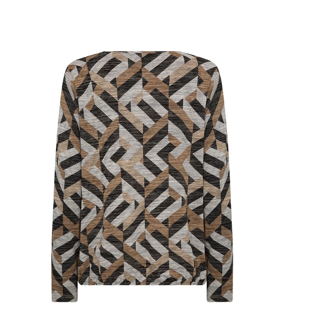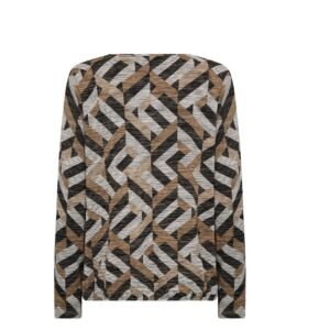 Μπλούζα με μοντέρνο γεωμετρικό print σε αποχρώσεις γκρί, μπεζ και μαύρου. Κατασκευασμένη από απαλό, ελαστικό ύφασμα με ανάγλυφη υφή, προσφέρει άνετη εφαρμογή και κομψή εμφάνιση. Διαθέτει μακρύ μανίκι, στρογγυλή λαιμόκοψη και ίσιο τελείωμα. Ιδανική επιλογή για το γραφείο ή casual chic εμφανίσεις με στυλ.