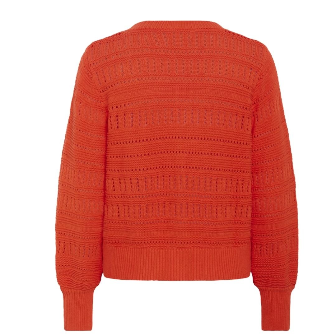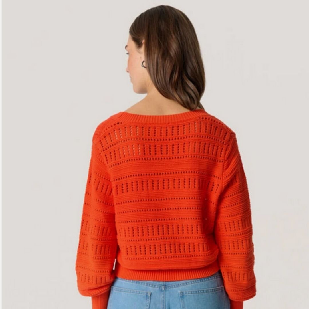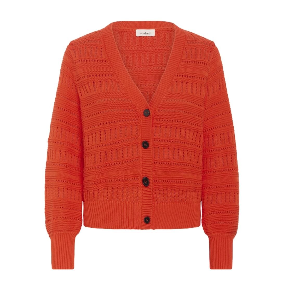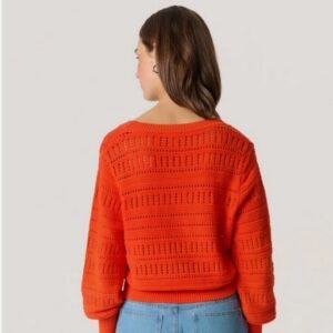 Ανανεώστε την εμφάνισή σας με αυτή τη μοντέρνα πλεκτή ζακέτα. Η εντυπωσιακή σκούρα πορτοκαλί απόχρωση και η κομψή, διάτρητη πλέξη της (αζούρ) την καθιστούν το τέλειο κομμάτι για τις δροσερές μέρες. Διαθέτει άνετη V λαιμόκοψη, κουμπιά σε σκούρα αντίθεση και ελαφρώς φουσκωτά μανίκια που χαρίζουν στυλ σε κάθε σας ντύσιμο.