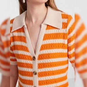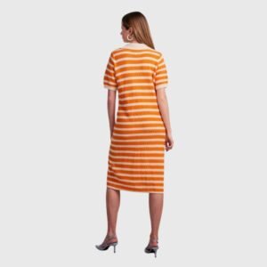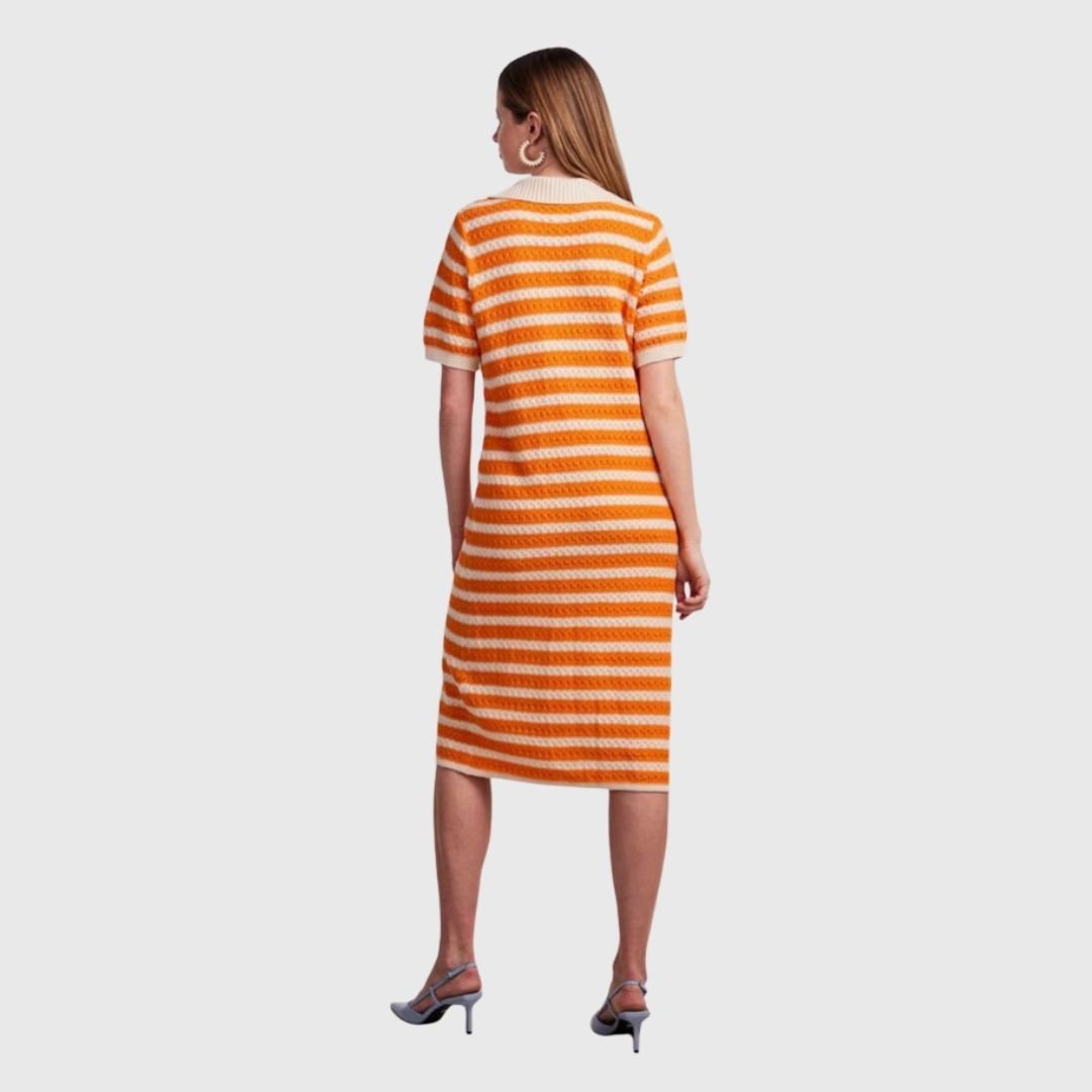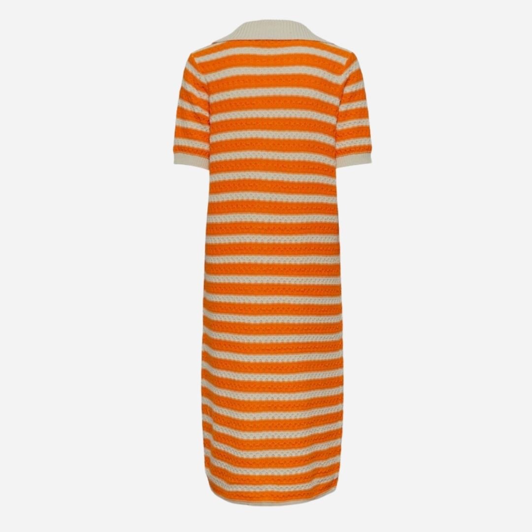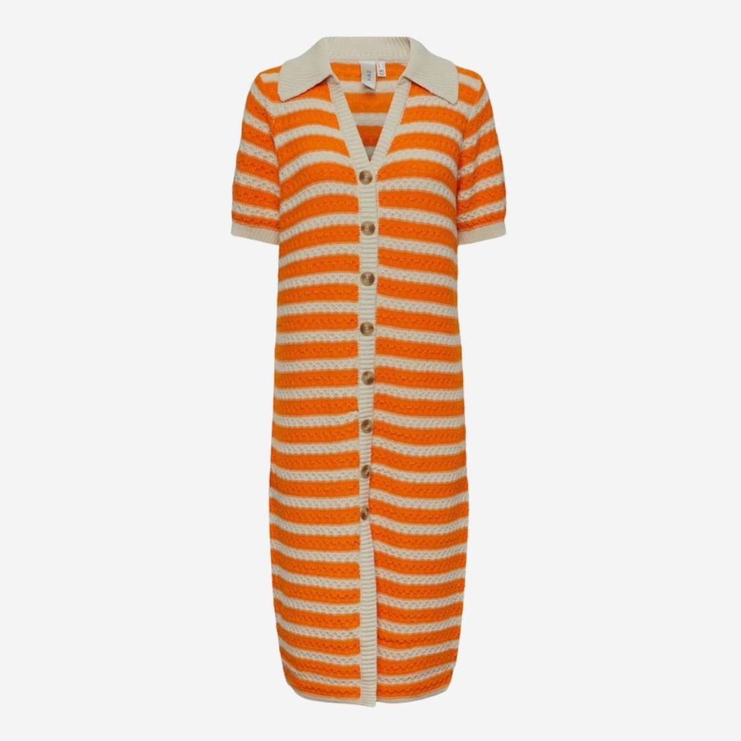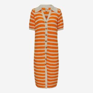 Πλεκτό ριγέ φόρεμα σε γραμμή σεμιζιέ, με πορτοκαλί και εκρού ρίγες. Διαθέτει κοντά μανίκια, κουμπιά σε όλο το μήκος και διακριτικό άνοιγμα μπροστά για άνεση στην κίνηση. Ένα κομψό και δροσερό κομμάτι που χαρίζει ρετρό διάθεση και ιδανικό στυλ για τις καλοκαιρινές εμφανίσεις.