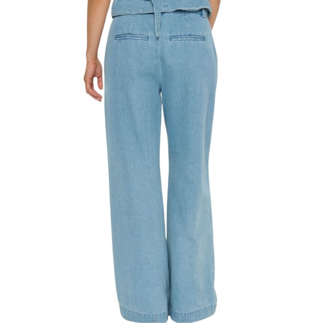 • Λεπτομέρεια μπροστινής μέσης τζιν παντελονιού wide leg με πιέτες.