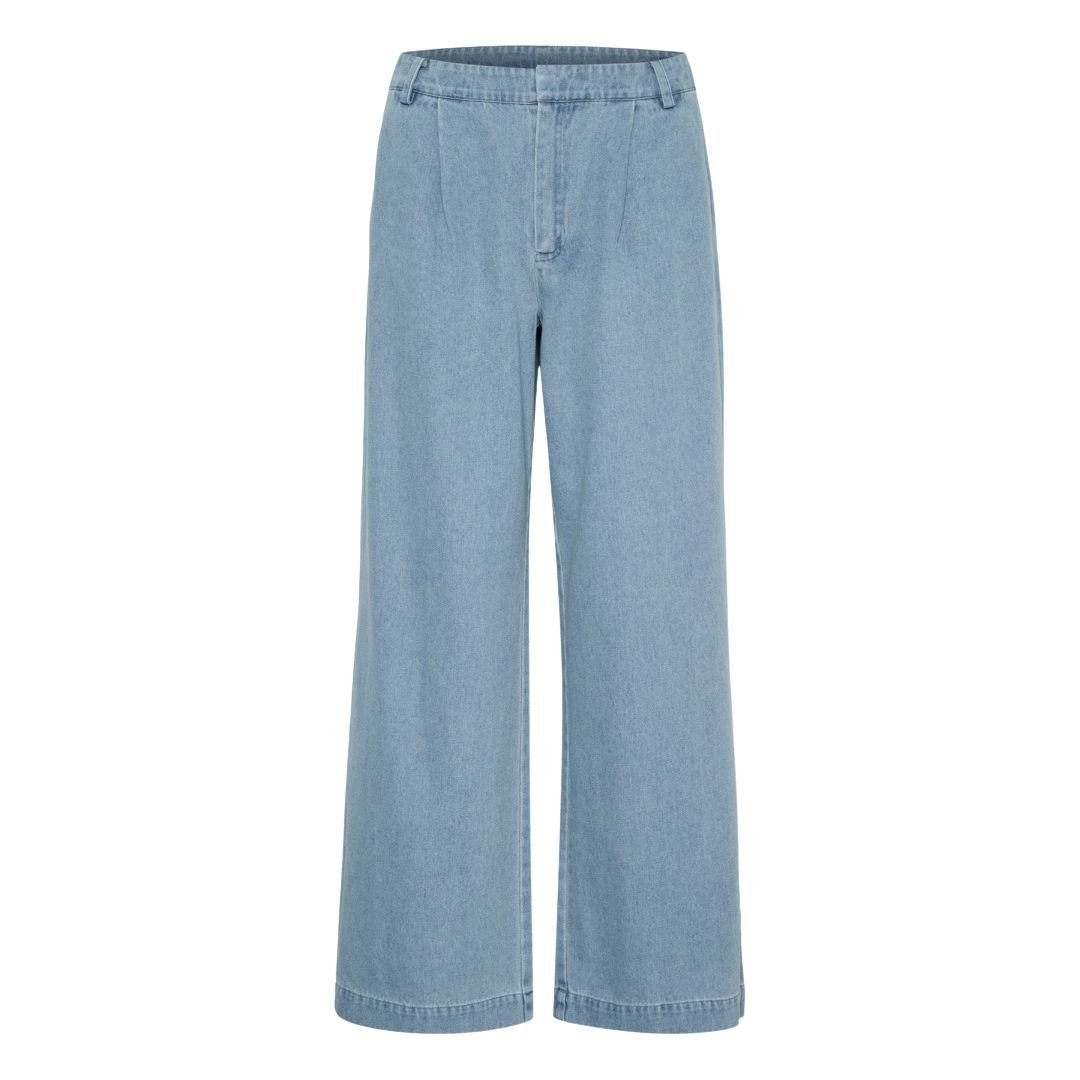 • Μπροστινή λήψη τζιν παντελονιού wide leg σε ανοιχτό μπλε με πιέτες.