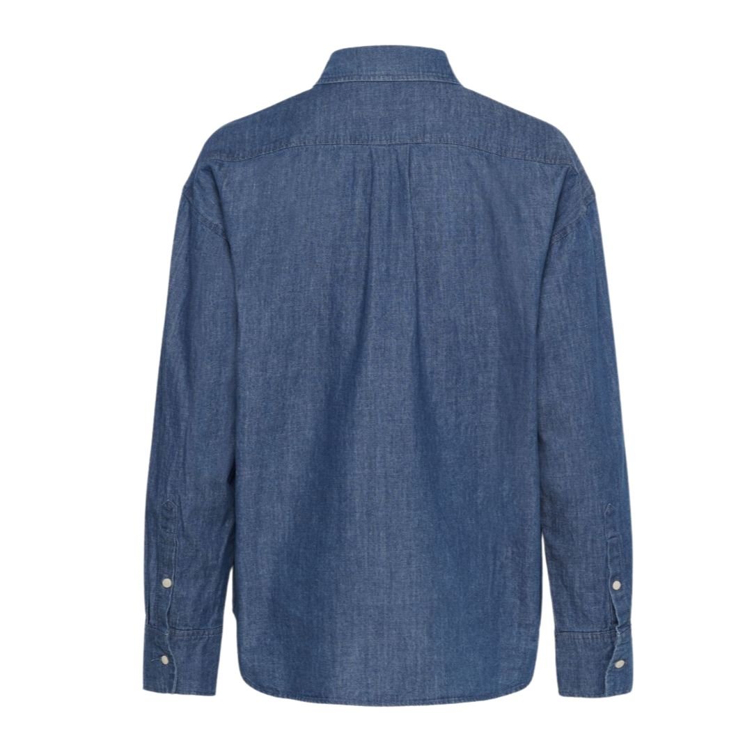 • Πίσω όψη denim πουκαμίσου Soaked in Luxury σε σκούρο indigo χρώμα. Διακρίνονται οι ραφές στους ώμους και η απαλή πτύχωση στο πίσω μέρος για άνετη εφαρμογή. Η φωτογραφία έχει καθαρό λευκό φόντο και αναδεικνύει τη φυσική υφή του βαμβακιού.