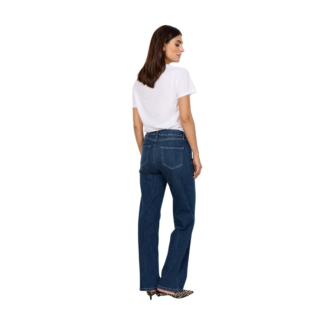 • Γυναίκα φορά το τζιν SC-KIMBERLY 34-B σε σκούρο μπλε denim με straight γραμμή και πεντάτσεπο σχέδιο. Το συνδυάζει με λευκό T-shirt και zebra-print flats, σε φυσικό φόντο με απαλό φωτισμό και υφή τοίχου σε γήινους τόνους.