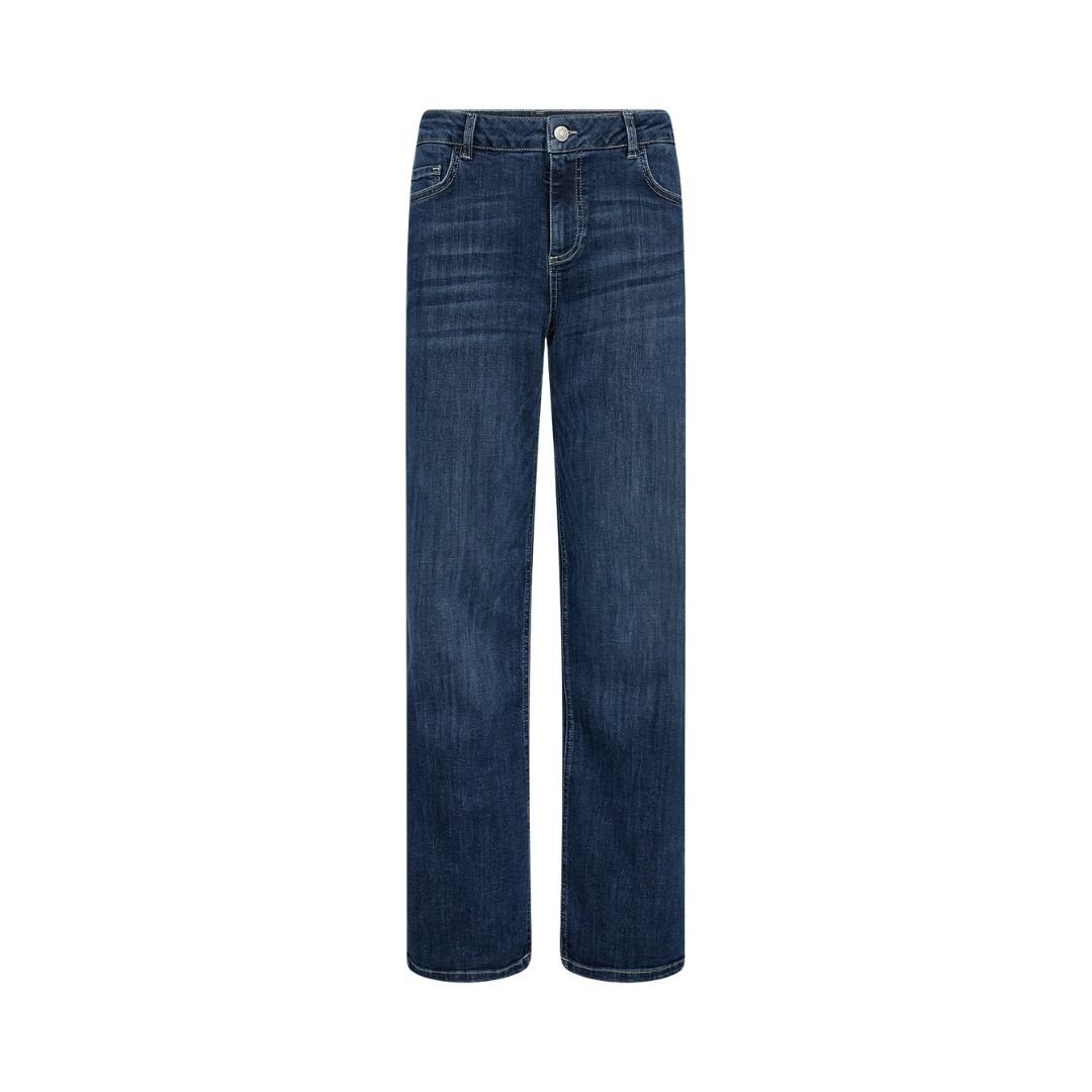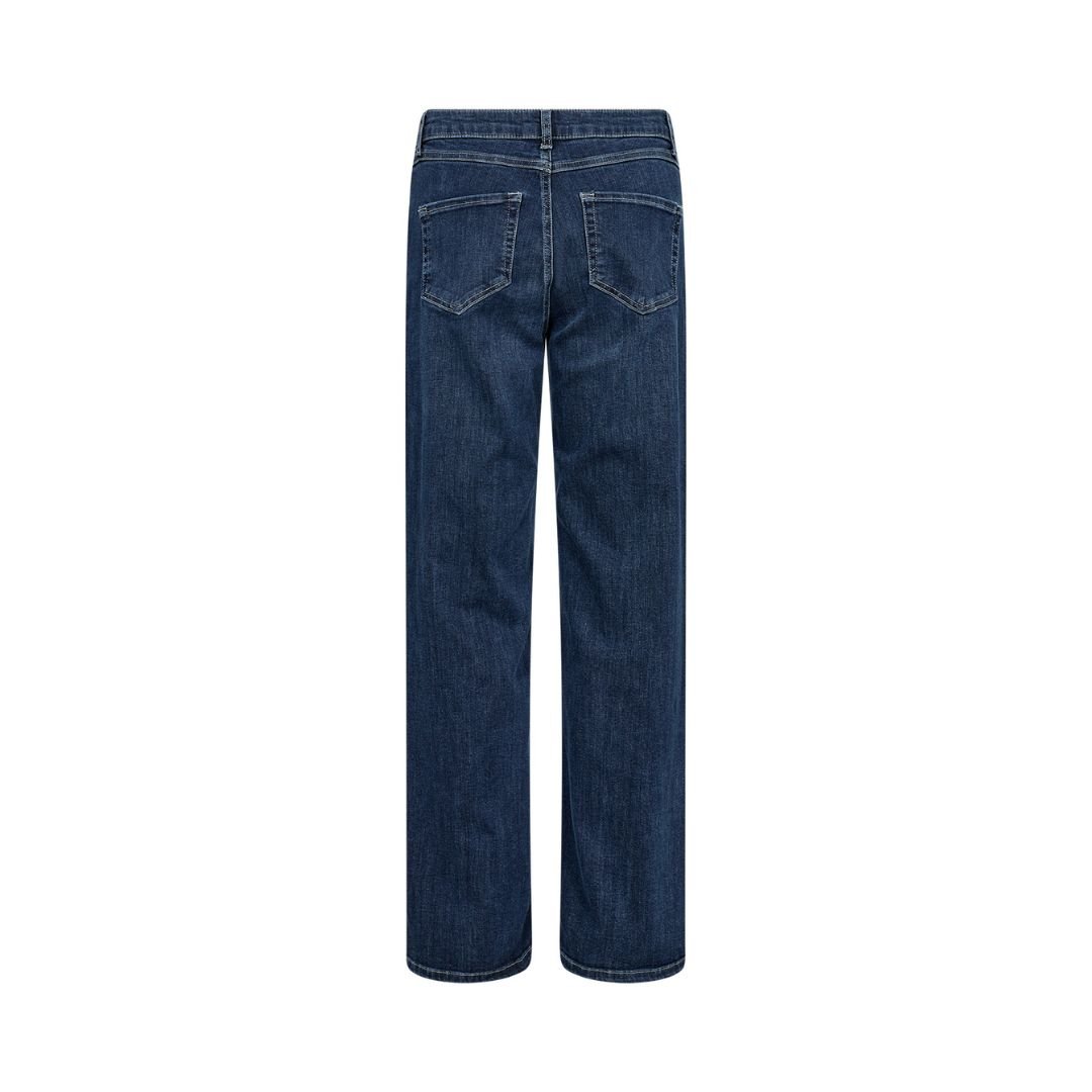 • Ίσιο τζιν σε σκούρο μπλε denim, μπροστινή όψη. Διακρίνεται το πεντάτσεπο design, οι ραφές σε αντίθεση και η straight γραμμή του υφάσματος. Προβολή προϊόντος σε λευκό φόντο studio.